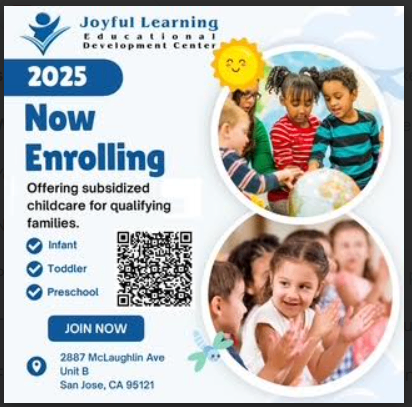 If you are interested, please contact Amparo at amparo@joyfullearningedc.org or call at 408-591-8597. This is a wonderful opportunity, as childcare is expensive, and they are working with ALL children. Therefore, they serve children regardless of disability or special needs. Pass this on to your family and friends here in Santa Clara County.